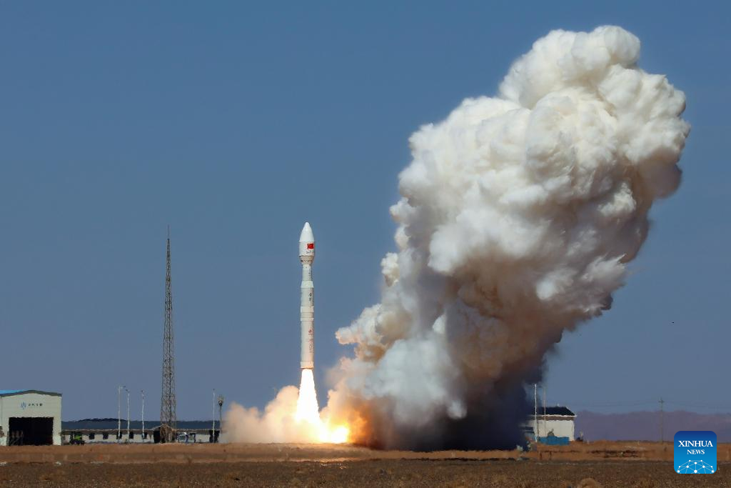 A Lijian-1 Y12 carrier rocket carrying eight satellites blasts off from the Dongfeng commercial space innovation pilot zone in northwest China, April 14, 2026. The rocket blasted off at 12:03 p.m. (Beijing Time) and successfully sent the satellites into their planned orbits. [Photo/Xinhua]