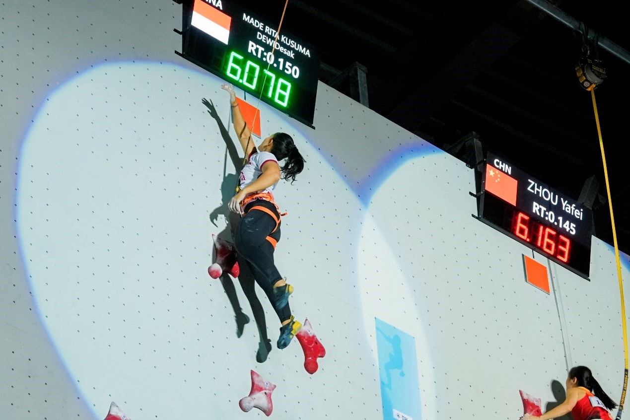 Desak Made Rita Kusuma Dewi sets a new Asian record in the women's speed final, April 9, 2026. [Photo provided to China.org.cn]