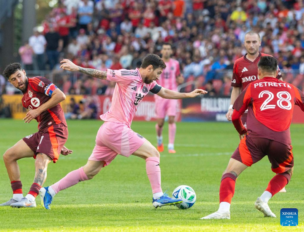Lionel Messi (2nd L) of Inter Miami CF breaks through during the 2025 Major League Soccer(MLS) regular season match between Toronto FC and Inter Miami CF at BMO Field in Toronto, Canada, on Sept. 27, 2025. (Photo by Zou Zheng/Xinhua)