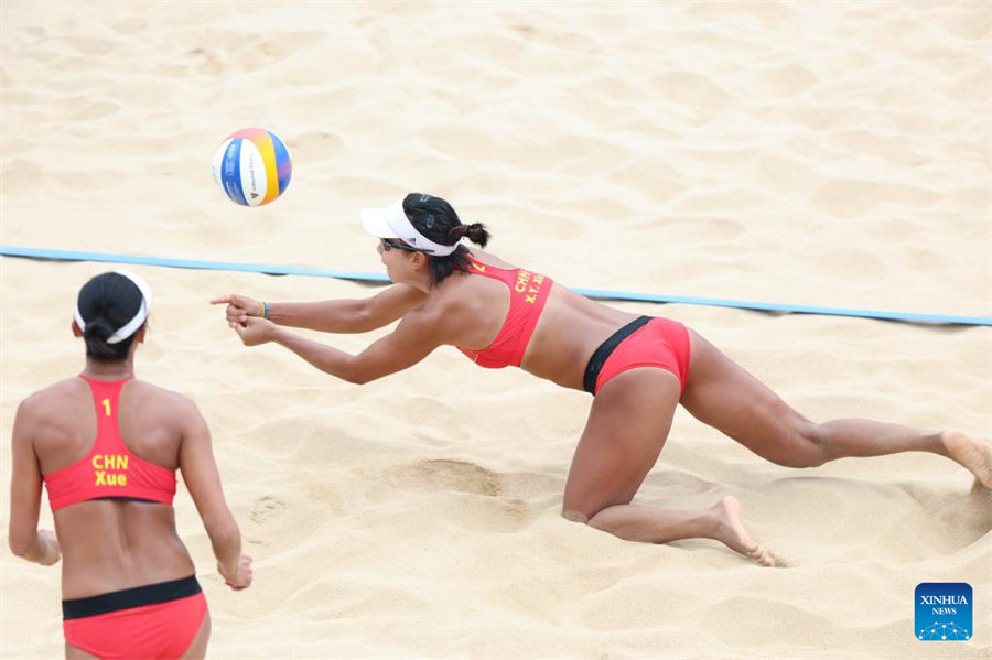 Xia Xinyi (R) saves the ball during the women's beach volleyball preliminary match between Xue Chen/Xia Xinyi of China and Shin Jieun/Kim Seyeon of the Republic of Korea at the 19th Asian Games in Ningbo, east China's Zhejiang Province, Sept. 22, 2023. (Xinhua/Zhang Tao)