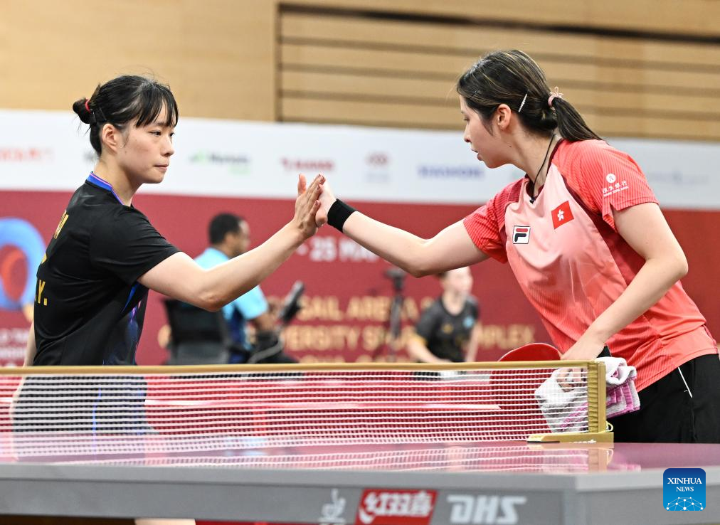 Shi Xunyao (L) and Lam Yee Lok greet each other after the women's singles round of 128 match between Shi Xunyao of China and Lam Yee Lok of China's Hongkong at ITTF World Table Tennis Championships Finals Doha 2025 in Doha, Qatar, May 18, 2025. (Xinhua/He Changshan)