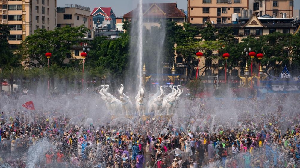 People celebrate the water-splashing festival at a square in Jinghong, Xishuangbanna Dai Autonomous Prefecture, southwest China's Yunnan province, April 15, 2026. The water-splashing festival is regarded as one of the most important festivals of ethnic groups in southwest China. During the festival, water is considered an auspicious symbol and people splash water on one another, thereby wishing happiness and good fortune. (Xinhua/Jiang Wenyao)