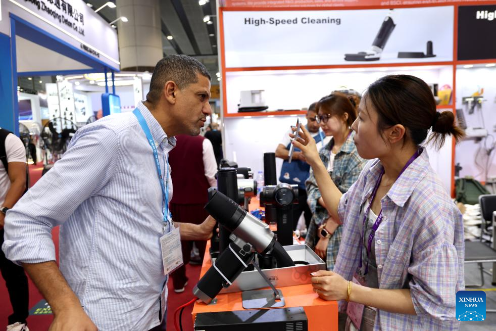 An overseas buyer (L) learns about a product during the 139th edition of the China Import and Export Fair in Guangzhou, south China's Guangdong Province, April 15, 2026. (Xinhua/Lu Hanxin)