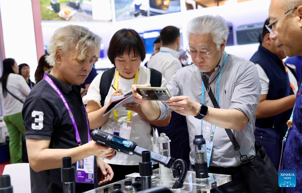Overseas buyers learn about a vacuum cleaner during the 139th edition of the China Import and Export Fair in Guangzhou, south China's Guangdong Province, April 15, 2026. (Xinhua/Lu Hanxin)