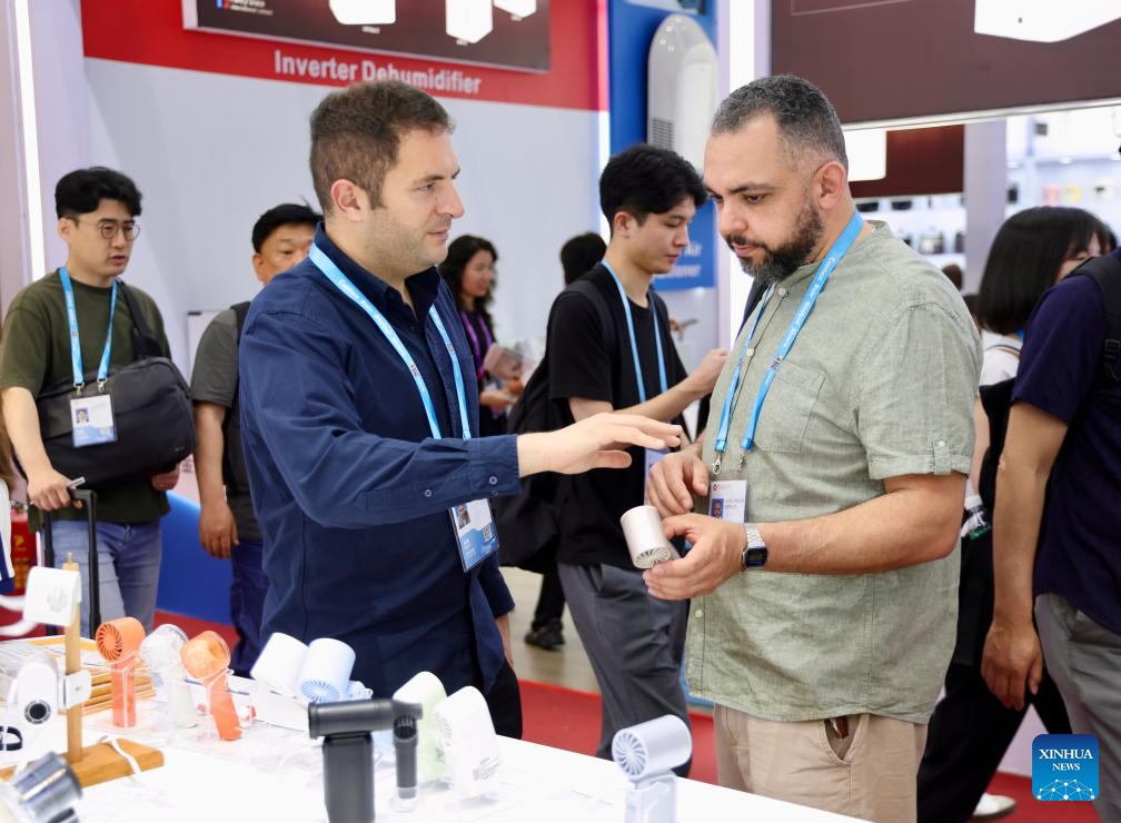 Overseas buyers learn about an electric fan during the 139th edition of the China Import and Export Fair in Guangzhou, south China's Guangdong Province, April 15, 2026. (Xinhua/Lu Hanxin)
