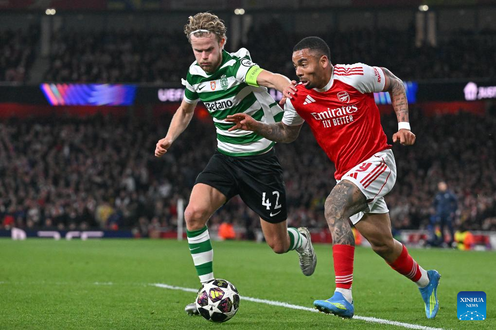Gabriel Jesus (R) of Arsenal battles with Morten Hjulmand of Sporting CP during the UEFA Champions League quarterfinal 2nd Leg football match between Arsenal and Sporting CP in London, Britain, April 15, 2026. (Xinhua)