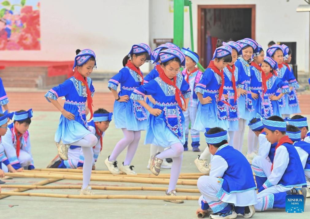 Students perform bamboo pole dance at a primary school in Changzhou District of Wuzhou City, south China's Guangxi Zhuang Autonomous Region, April 15, 2026. The Sanyuesan Festival is a traditional festival celebrated on the third day of the third lunar month by various ethnic groups in China, which falls on April 19 this year. (Xinhua/Huang Xiaobang)
