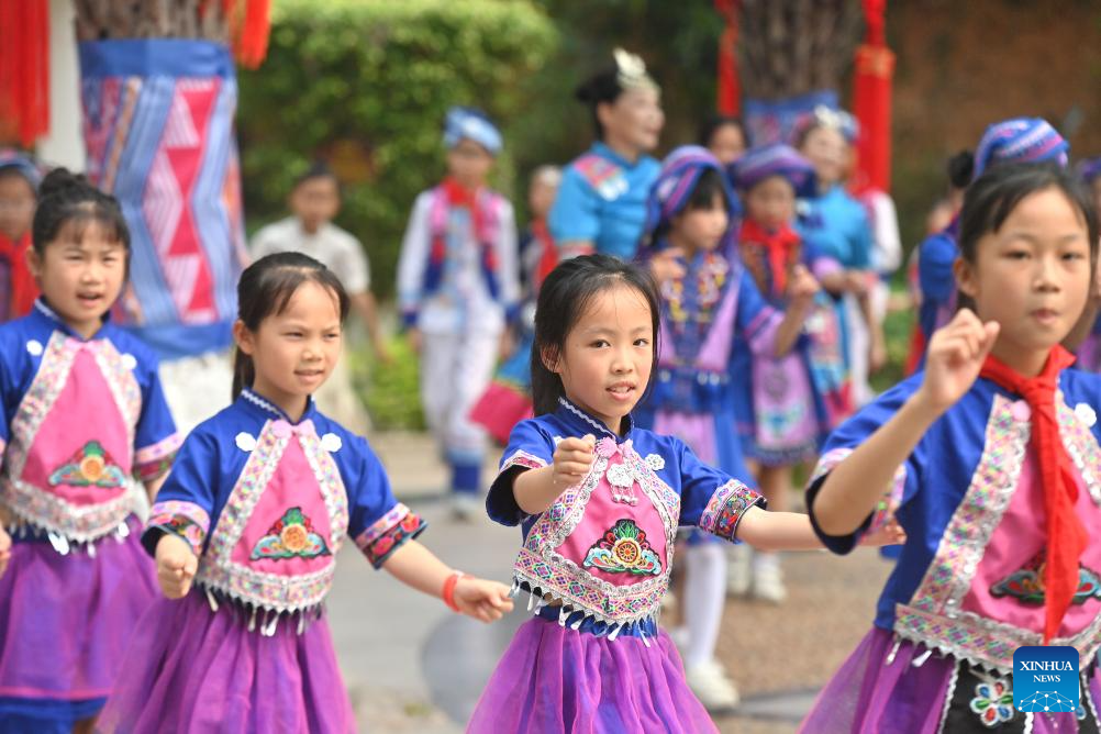 Students dance at a primary school in Changzhou District of Wuzhou City, south China's Guangxi Zhuang Autonomous Region, April 15, 2026. The Sanyuesan Festival is a traditional festival celebrated on the third day of the third lunar month by various ethnic groups in China, which falls on April 19 this year. (Xinhua/Huang Xiaobang)