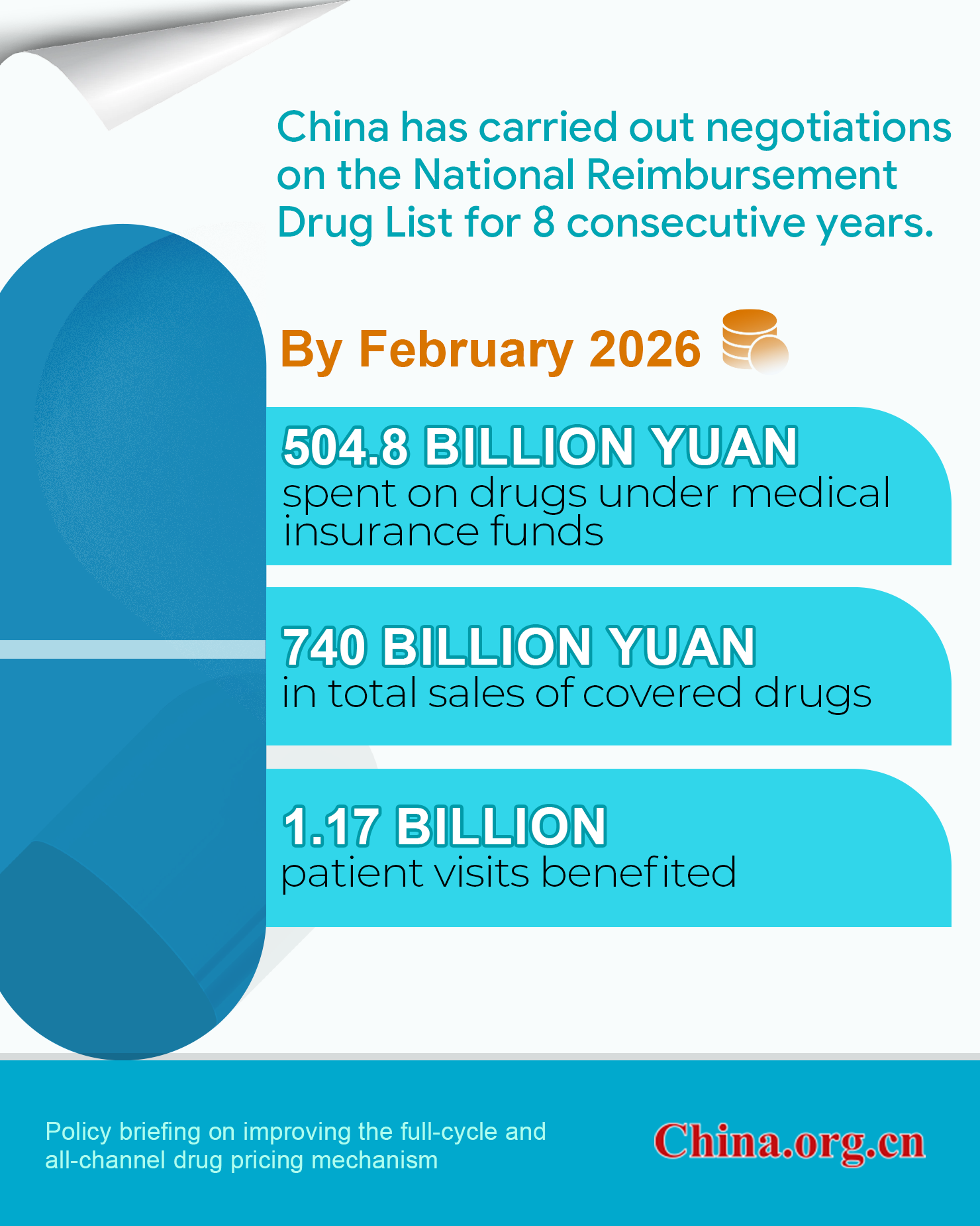 China has carried out negotiations on the National Reimbursement Drug List for eight consecutive years to expand medical insurance coverage, with the medical insurance funds spending 504.8 billion yuan (US$74.04 billion) on medicines under insurance coverage and benefiting 1.17 billion patient visits as of February, an official said Wednesday.