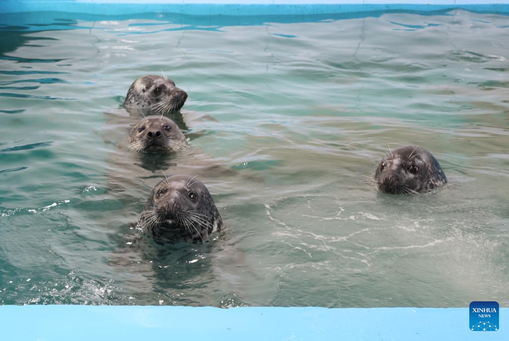 Rescued spotted seals, which are not yet released into the sea due to their health conditions, are pictured in a pool at the Liaoning Ocean and Fisheries Science Research Institute in Dalian, northeast China's Liaoning province, April 15, 2026. Five spotted seals were released into waters off the coast of Dalian on Thursday. Three of them were rescued and rehabilitated by the Liaoning Ocean and Fisheries Science Research Institute, while the other two were artificially bred by Sunasia Ocean World in Dalian.