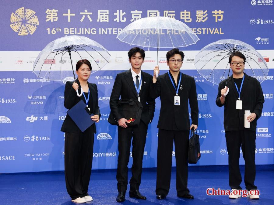 The cast and crew of "Make Zhonghe Better Again" pose for a photo on the red carpet at the 16th Beijing International Film Festival opening ceremony in Beijing, April 16, 2026. [Photo by Dong Ning/China.org.cn]