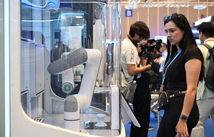 A visitor looks at an ice cream making robot at the 139th edition of the China Import and Export Fair in Guangzhou, south China's Guangdong Province, April 15, 2026. [Xinhua/Deng Hua]