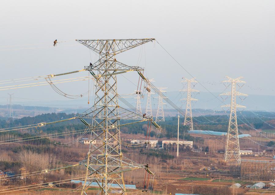 A drone photo taken on Dec. 16, 2025 shows constructors working on a power transmission line in east China's Anhui Province. [Photo by Zheng Xianlie/Xinhua]
