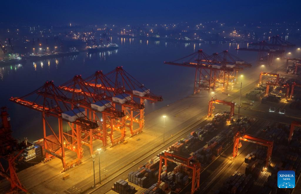 An aerial drone photo taken on April 18, 2026 shows a container terminal of the Jingtang area of Tangshan Port in Tangshan, north China's Hebei Province.