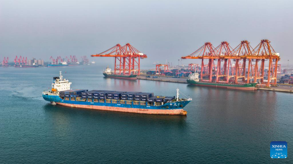 A drone photo taken on April 17, 2026 shows a vessel docking at the Jingtang area of Tangshan Port in Tangshan, north China's Hebei Province.