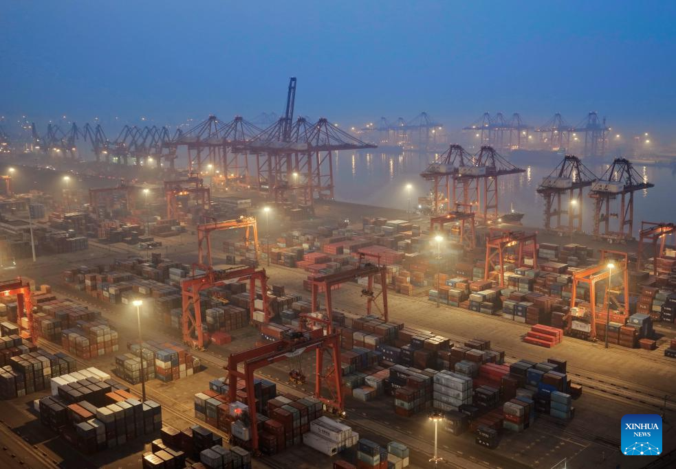 An aerial drone photo taken on April 18, 2026 shows a container terminal of the Jingtang area of Tangshan Port in Tangshan, north China's Hebei Province.