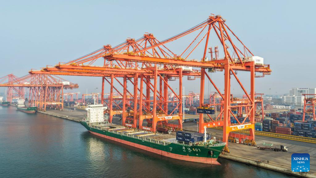 A drone photo taken on April 17, 2026 shows a vessel docking at the Jingtang area of Tangshan Port to load and unload containers in Tangshan, north China's Hebei Province.