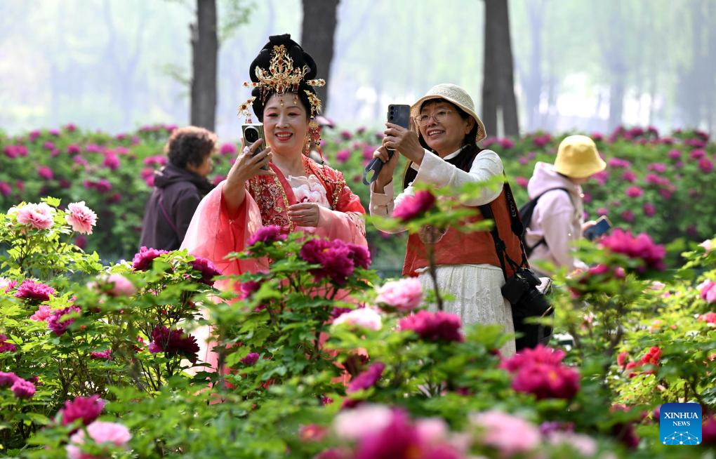 Tourists take photos at the peony garden of the Shijiazhuang botanical garden in Shijiazhuang, north China's Hebei Province, April 15, 2026. [Photo by Chen Qibao/Xinhua]