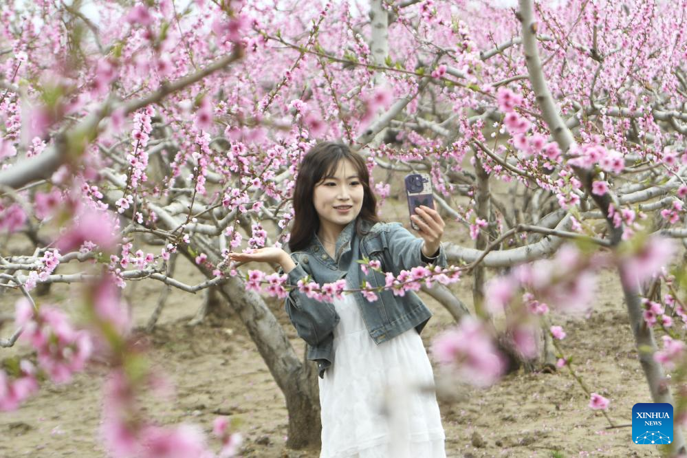A tourist takes selfies at a peach orchard in Nanyuan Township, Linxia County of Linxia Hui Autonomous Prefecture, northwest China's Gansu Province, April 16, 2026. [Photo by Shi Youdong/Xinhua]