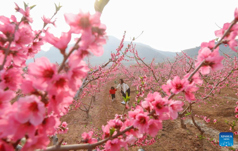 Tourists enjoy blossoms at a peach orchard in Dangyu Town of Zunhua City, north China's Hebei Province, April 15, 2026. [Photo by Liu Mancang/Xinhua]