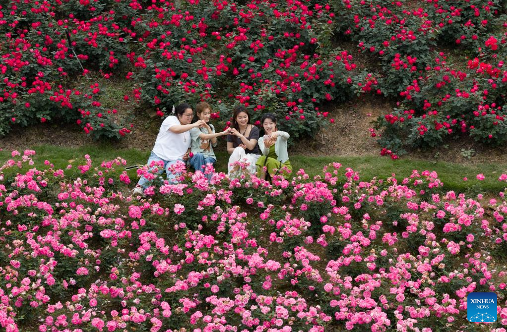 A drone photo taken on April 15, 2026 shows people taking selfies amid flowers in Cuiping District of Yibin City, southwest China's Sichuan Province. [Photo by Peng Minxiang/Xinhua]