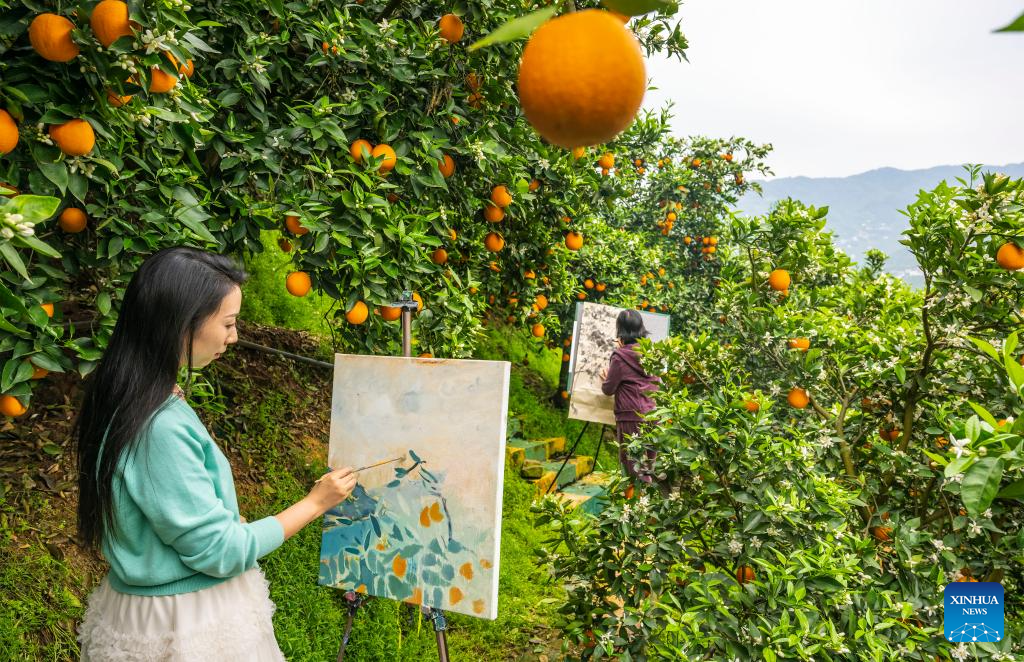 People paint at an orange orchard of Shuitianba Township, Zigui County of central China's Hubei Province, April 15, 2026. [Photo by Zheng Jiayu/Xinhua]