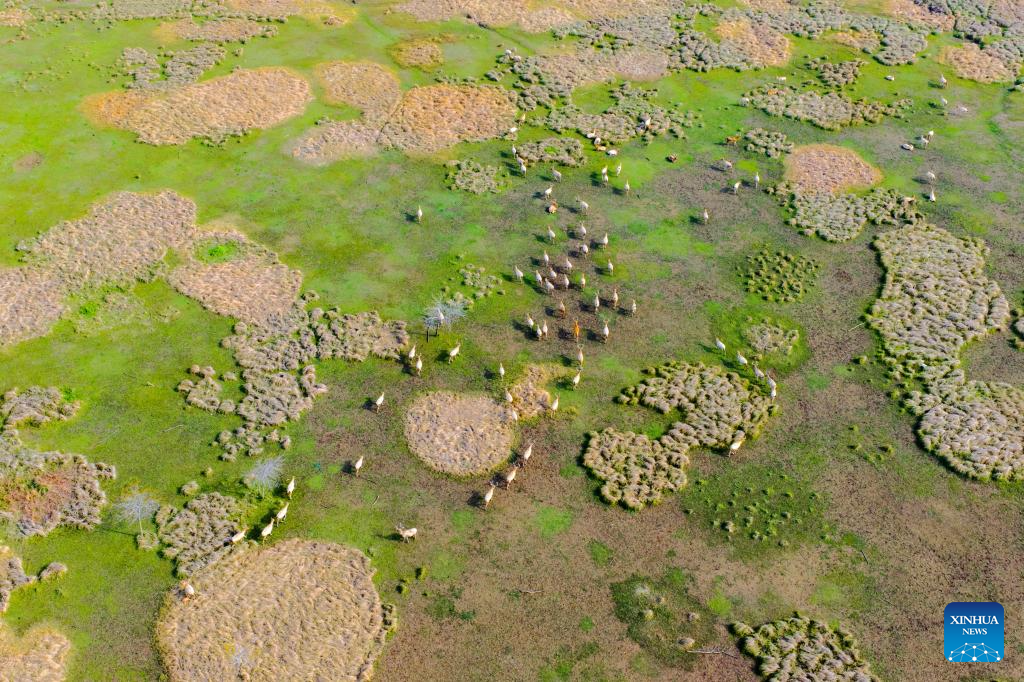An aerial drone photo taken on April 15, 2026 shows elks foraging at Tiaozini wetland in Dongtai of Yancheng City, east China's Jiangsu Province. [Photo by Sun Jialu/Xinhua]