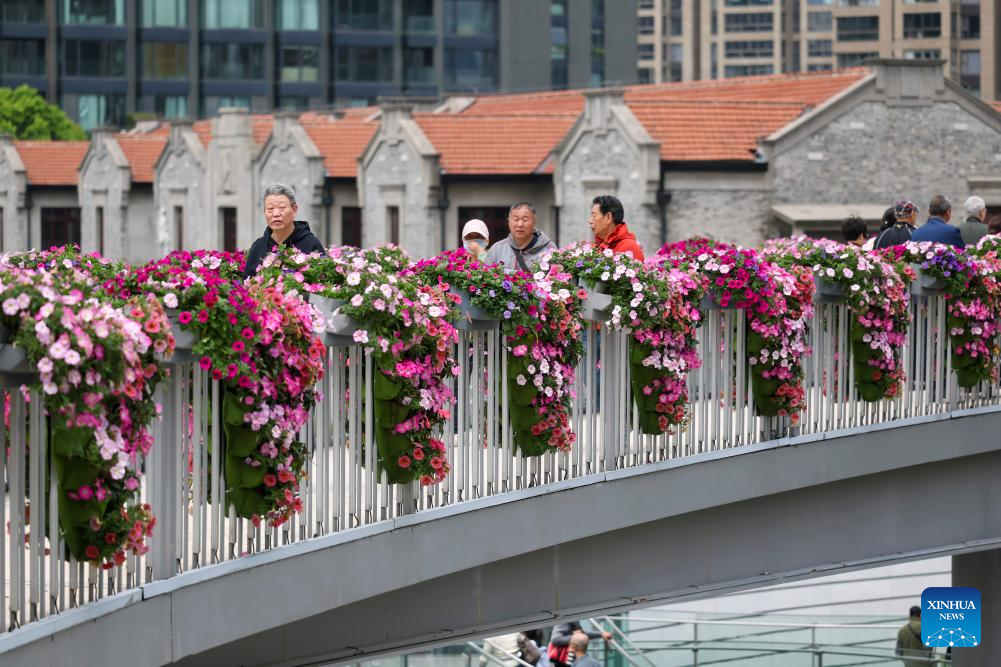 People visit a flower fair in Jing'an District of Shanghai, east China, April 18, 2026. The 2026 Shanghai International Flower Show opened on Saturday with events in two main venues, 10 sub-venues and multiple exhibition spots across the city. (Xinhua/Wang Xiang)
