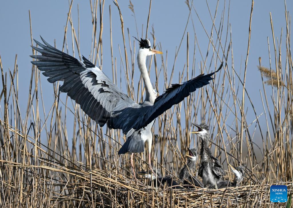 A heron returns to its nest at Shahu scenic area in Pingluo County of Shizuishan City in northwest China's Ningxia Hui Autonomous Region, April 17, 2026. From March to October each year, the Shahu scenic area serves as an important breeding habitat for migratory birds, featuring vast expanses of water, abundant plankton, fish and shrimp, and a variety of ecosystems.