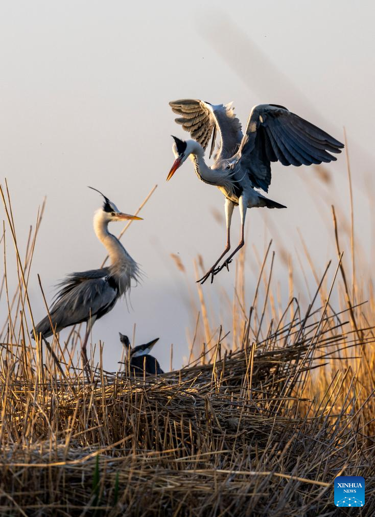 Herons return to their nest at Shahu scenic area in Pingluo County of Shizuishan City in northwest China's Ningxia Hui Autonomous Region, April 17, 2026. From March to October each year, the Shahu scenic area serves as an important breeding habitat for migratory birds, featuring vast expanses of water, abundant plankton, fish and shrimp, and a variety of ecosystems.