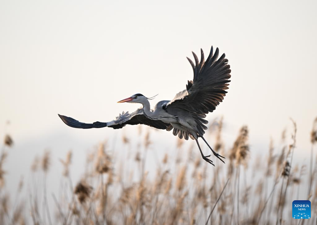 A heron flies among reeds at Shahu scenic area in Pingluo County of Shizuishan City in northwest China's Ningxia Hui Autonomous Region, April 17, 2026. From March to October each year, the Shahu scenic area serves as an important breeding habitat for migratory birds, featuring vast expanses of water, abundant plankton, fish and shrimp, and a variety of ecosystems.