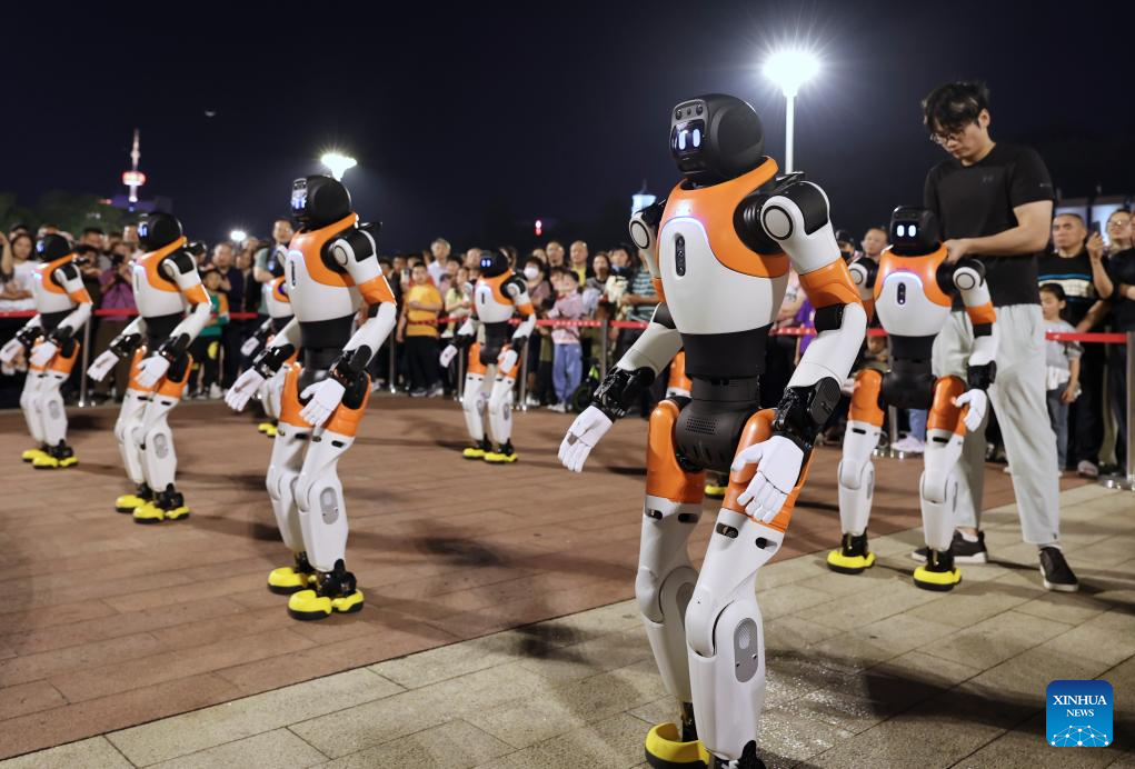 A staff member adjusts robots before their dance performance in Fuzhou, southeast China's Fujian Province, April 19, 2026. A robot dance performance was staged here to welcome the 9th Digital China Summit, which will convene in Fuzhou from April 29 to 30. (Xinhua/Jiang Kehong)