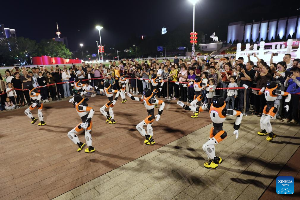 Robots dance in Fuzhou, southeast China's Fujian Province, April 19, 2026. A robot dance performance was staged here to welcome the 9th Digital China Summit, which will convene in Fuzhou from April 29 to 30. (Xinhua/Jiang Kehong)