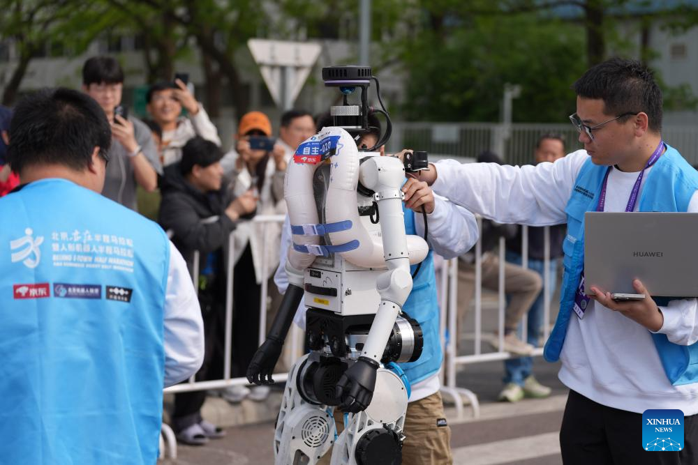 Engineers change batteries for the humanoid robot "Tiangong Ultra-2026" (C) of Tiantong Team in the autonomous category during the Beijing E-Town half-marathon and humanoid robots half-marathon in the Beijing Economic-Technological Development Area in southeast Beijing, China, April 19, 2026. (Xinhua/Xie Han)
