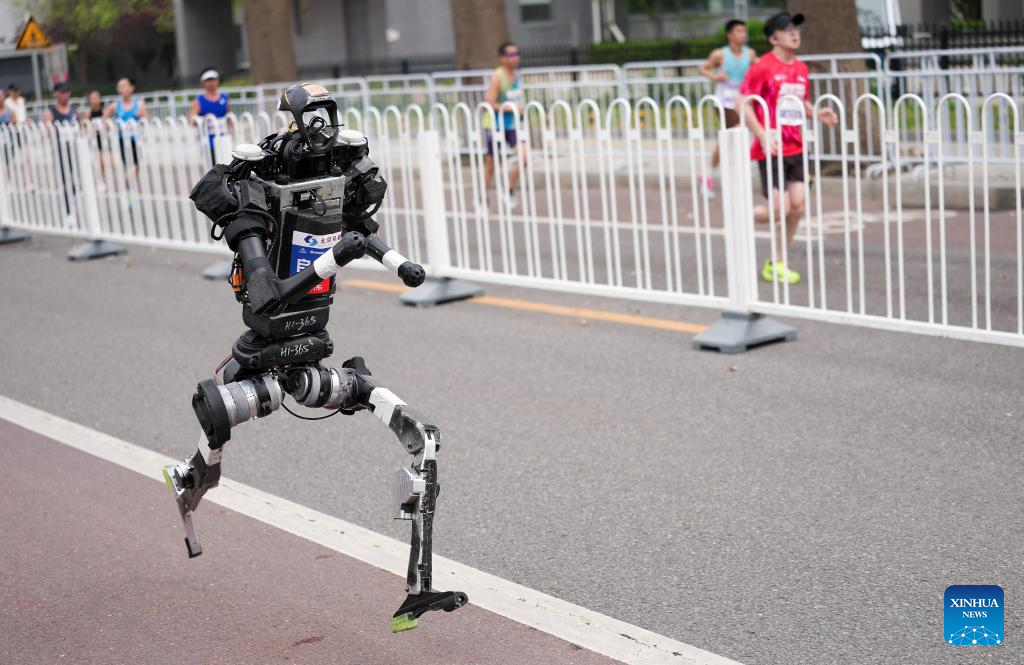 Humanoid robot "Unitree H1" (L) of Hang S Sai Team in the autonomous category runs during the Beijing E-Town half-marathon and humanoid robots half-marathon in the Beijing Economic-Technological Development Area in southeast Beijing, China, April 19, 2026. (Xinhua/Luo Yuan)
