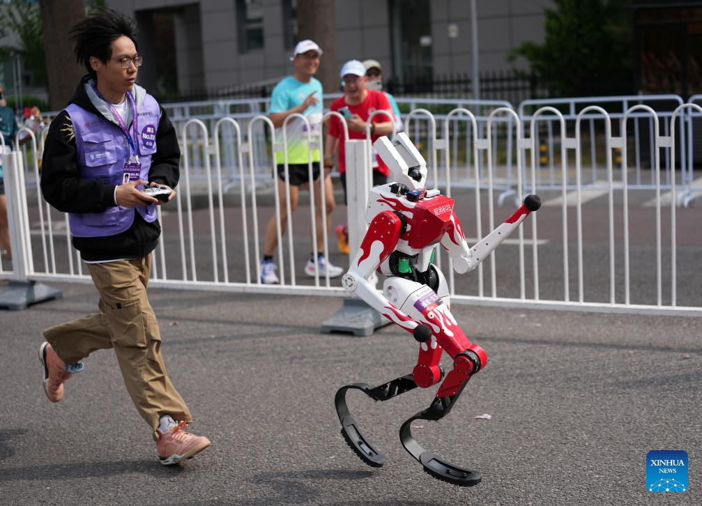 Humanoid robot "X1" (R, front) of Pofengzhe Team in the remote-controlled category runs during the Beijing E-Town half-marathon and humanoid robots half-marathon in the Beijing Economic-Technological Development Area in southeast Beijing, China, April 19, 2026. (Xinhua/Luo Yuan)