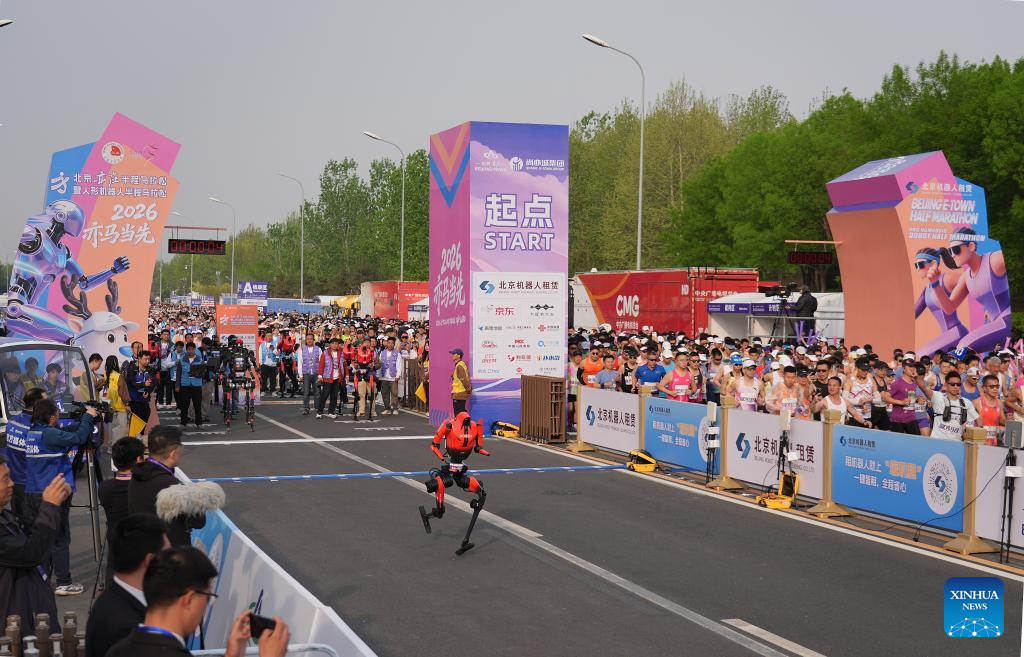 Humanoid robot "Flash" (C) of Jueyingchitu Team in the remote-controlled category starts during the Beijing E-Town half-marathon and humanoid robots half-marathon in the Beijing Economic-Technological Development Area in southeast Beijing, China, April 19, 2026. (Xinhua/Xie Han)