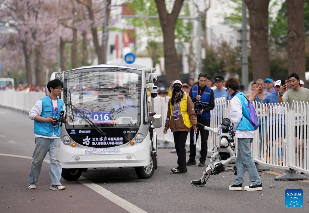 Humanoid robot "Tiangong 1.0 Ultra" (2nd R, front) of Tianxiao Team in the autonomous category falls down during the Beijing E-Town half-marathon and humanoid robots half-marathon in the Beijing Economic-Technological Development Area in southeast Beijing, China, April 19, 2026. (Xinhua/Luo Yuan)