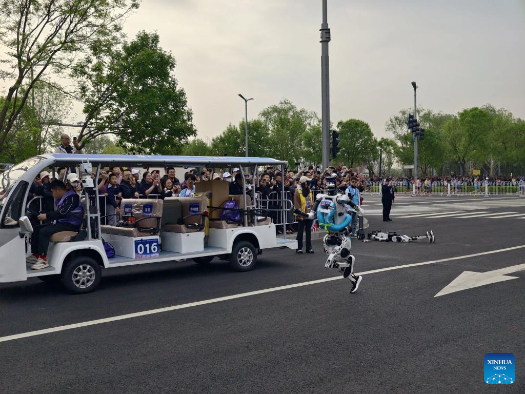 Humanoid robot "Tiangong 1.0 Ultra" of Tianxiao Team in the autonomous category runs during the Beijing E-Town half-marathon and humanoid robots half-marathon in the Beijing Economic-Technological Development Area in southeast Beijing, China, April 19, 2026. (Xinhua/Ju Huanzong)