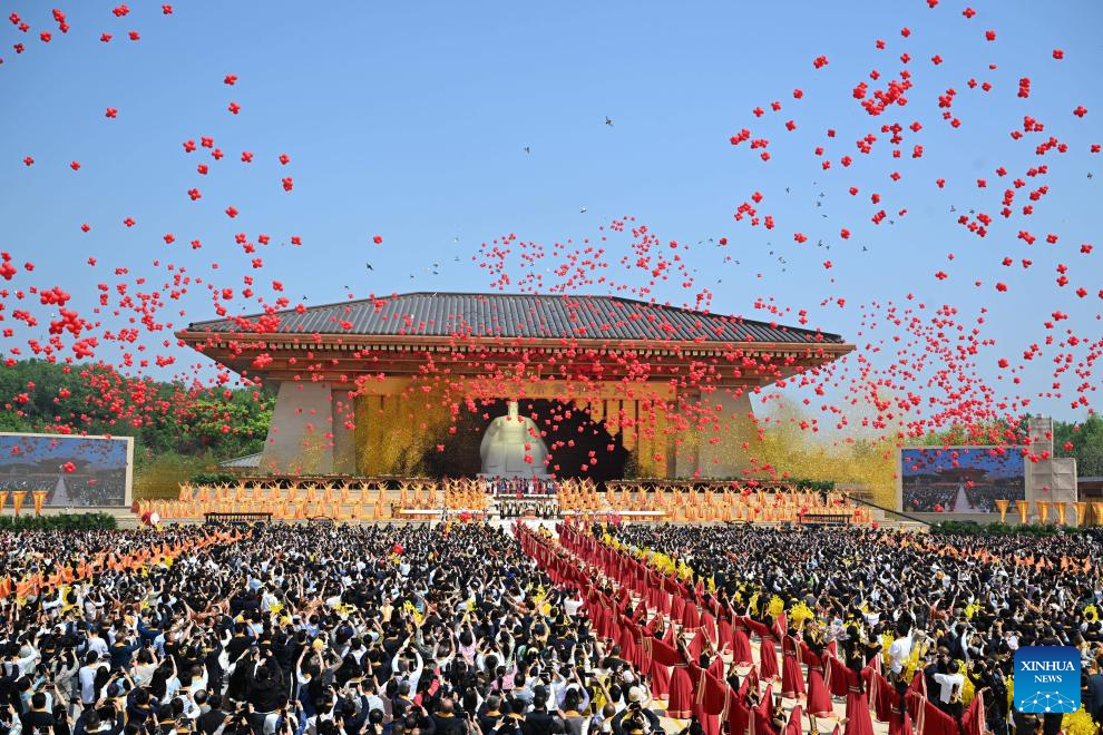 A ceremony to worship Huangdi, or the Yellow Emperor, is held in Xinzheng City, central China's Henan province, April 19, 2026. The third day of the third month on the Chinese lunar calendar, which fell on Sunday this year, is widely believed to be the birthday of Huangdi. As a legendary common ancestor of the Chinese people, Huangdi is believed to have been born in the county-level city of Xinzheng. Worshipping Huangdi is a tradition in China. The ceremony of ancestor worship in Huangdi's hometown was listed as a national intangible cultural heritage in 2008. (Xinhua/Li Jianan)