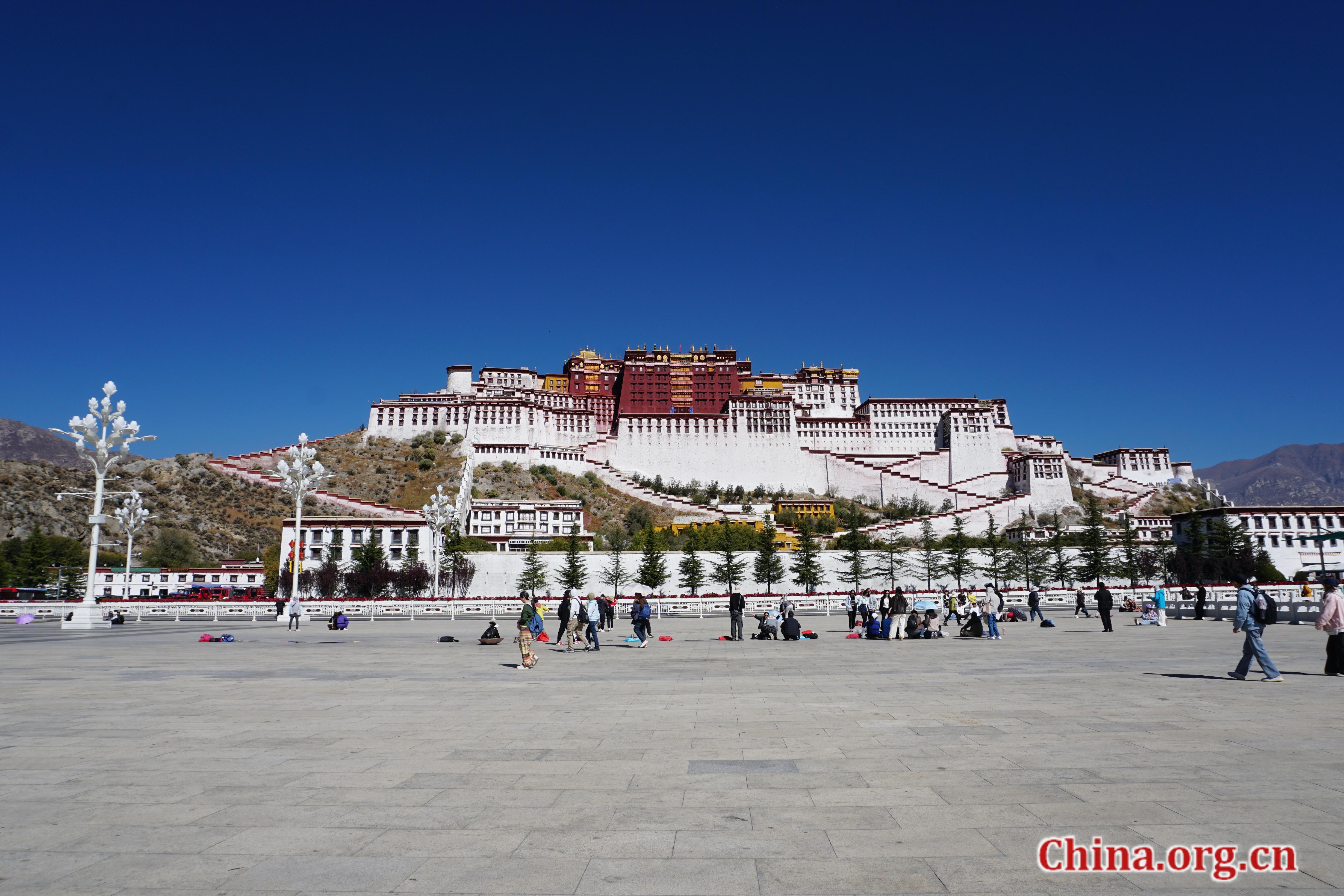 Visitors photograph the Potala Palace beneath clear skies at Potala Palace Square, Lhasa, southwest China's Xizang autonomous region, Oct. 21, 2025. [Photo by Li Congrong/China.org.cn]