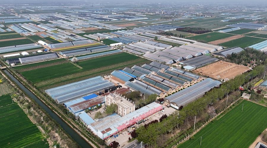 An aerial drone photo taken on April 9, 2026 shows a vegetable farm with agricultural technology support in Jingyang County, northwest China's Shaanxi Province. [Photo/Xinhua]
