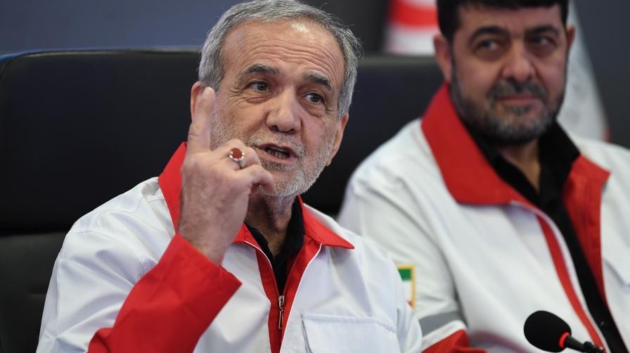 Iranian President Masoud Pezeshkian (L) speaks during his visit to the headquarters of Iran's Red Crescent Society in Tehran, Iran, April 15, 2026. [Photo/Xinhua]