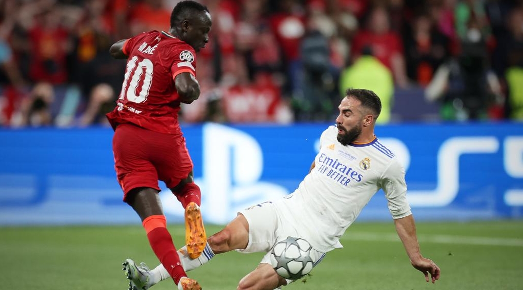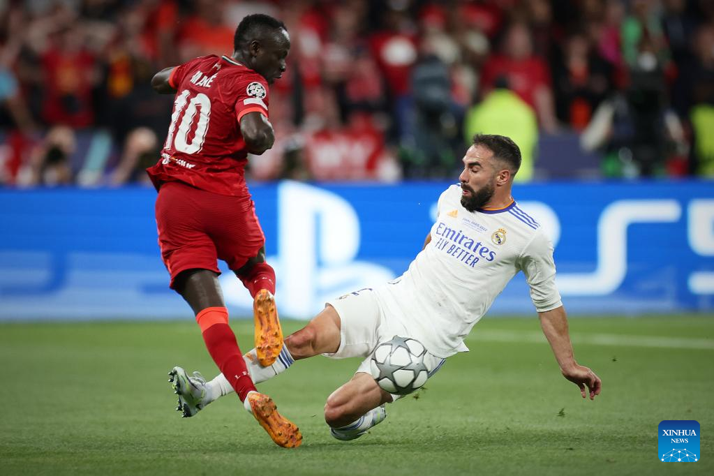 Real Madird's Dani Carvajal (R) vies with Liverpool's Sadio Mane during the UEFA Chamiopns League final match between Real Madrid and Liverpool, in Paris, France, on May 28, 2022. (Xinhua/Meng Dingbo)