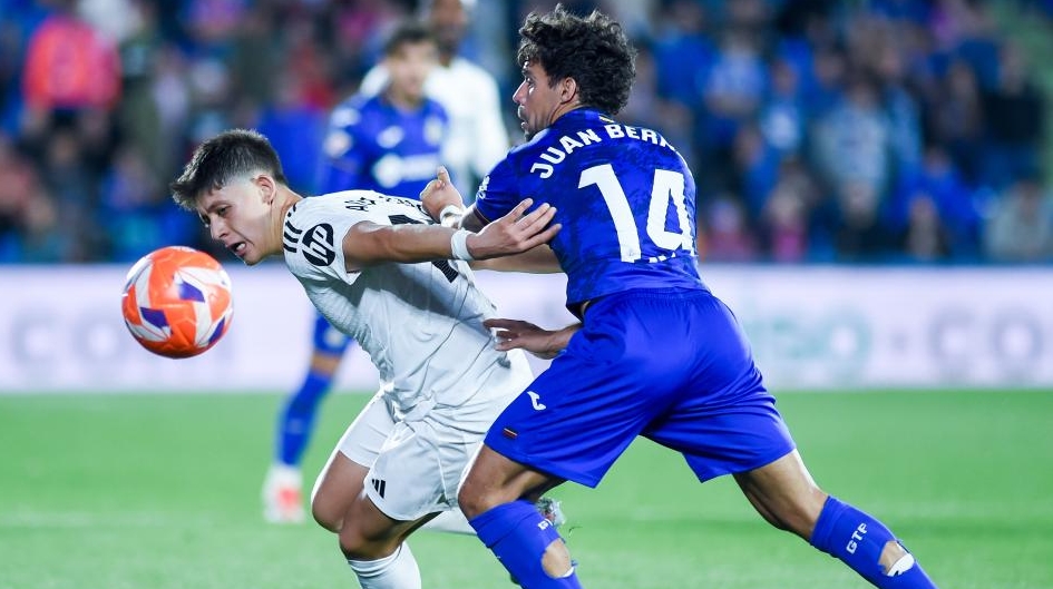 Arda Guler (L) of Real Madrid vies with Juan Bernat of Getafe CF during the Laliga football match between Real Madrid and Getafe CF in Coliseum Stadium, Madrid, Spain, on April 23, 2025. (Photo by Gustavo Valiente/Xinhua)
