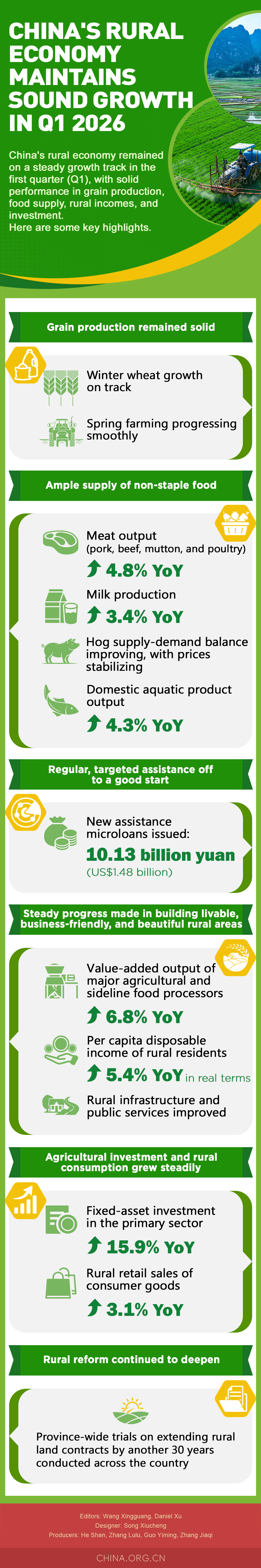 China's rural economy remained on a steady growth track in the first quarter (Q1), with solid performance in grain production, food supply, rural incomes, and investment, said Maierdan Mugaiti, vice minister of agriculture and rural affairs, at a press conference on Thursday.