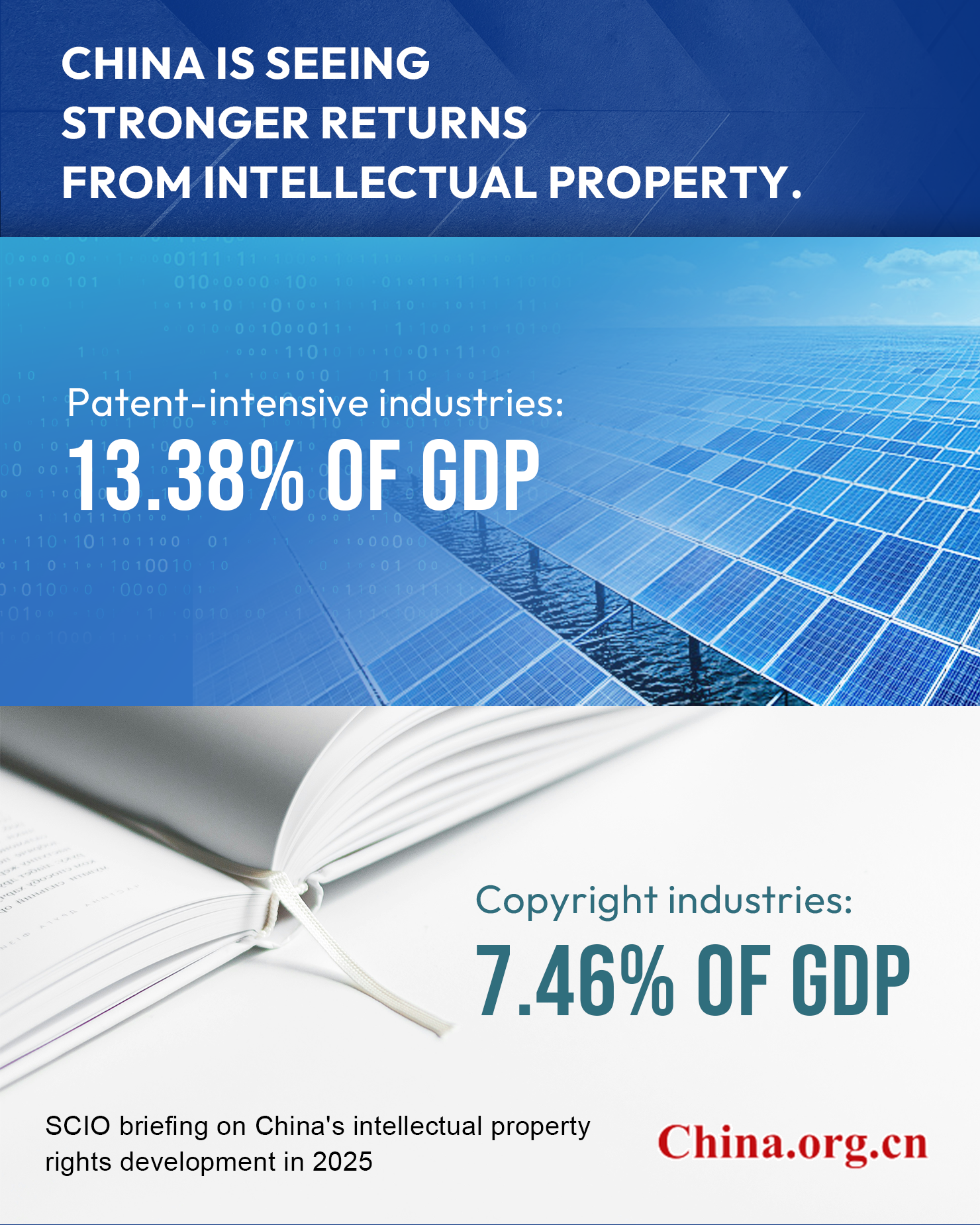 China is seeing stronger returns from intellectual property, with patent-intensive and copyright industries accounting for 13.38% and 7.46% of the country's GDP, respectively, the China National Intellectual Property Administration said Thursday.