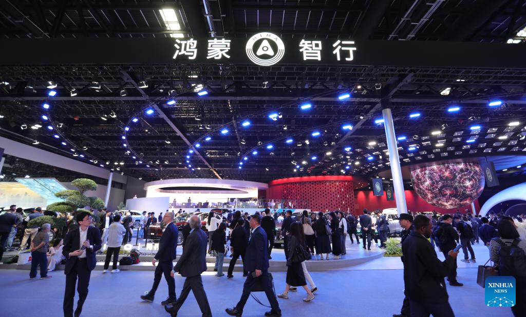 This photo taken on April 24, 2026 shows the booth of Harmony Intelligent Mobility Alliance during the 2026 Beijing International Automotive Exhibition in Beijing, capital of China. (Xinhua/Chang Nengjia)
