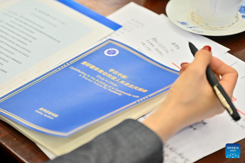 A copy of the think tank report titled "Study in China: Contributing to the Building of a Community with a Shared Future for Humanity" is pictured during a seminar for release of the report in Beijing, capital of China, April 25, 2026. The report was released by Xinhua Institute, a think tank affiliated with Xinhua News Agency, on Saturday. (Xinhua/Sun Ruibo)
