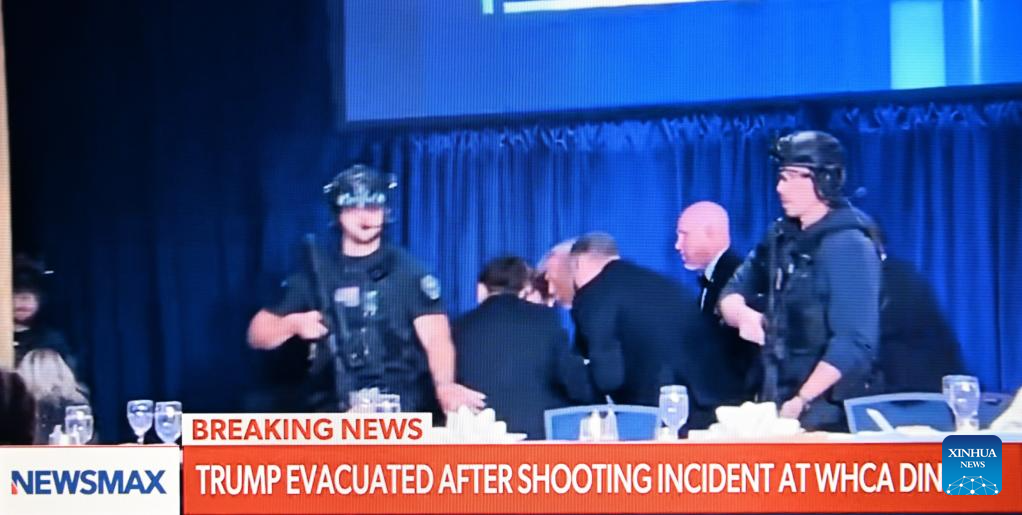 This photo taken on April 25, 2026 shows a screen displaying U.S. President Donald Trump being evacuated from the White House Correspondents' Dinner in Washington, D.C., the United States. [Photo/Xinhua]